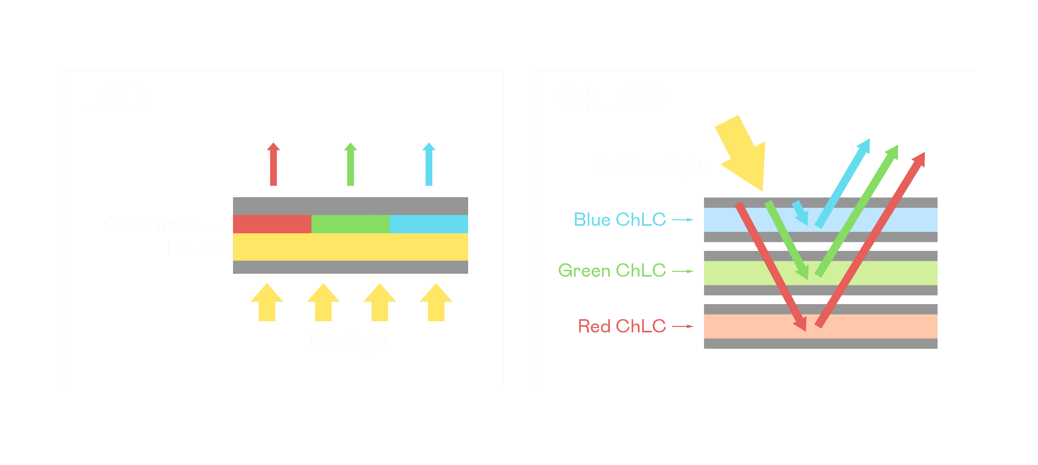 ChLCD 胆固醇液晶就如同纸张一样,,透过反射环境光来显示影像,,,,因此长时间观看不易造成人眼视觉疲劳,,,,可达到护眼效果。。。当处于户外阳光下使用,,LCD 影像容易失真而不易观看,,但胆固醇液晶仍可维持较佳的影像品质。。。