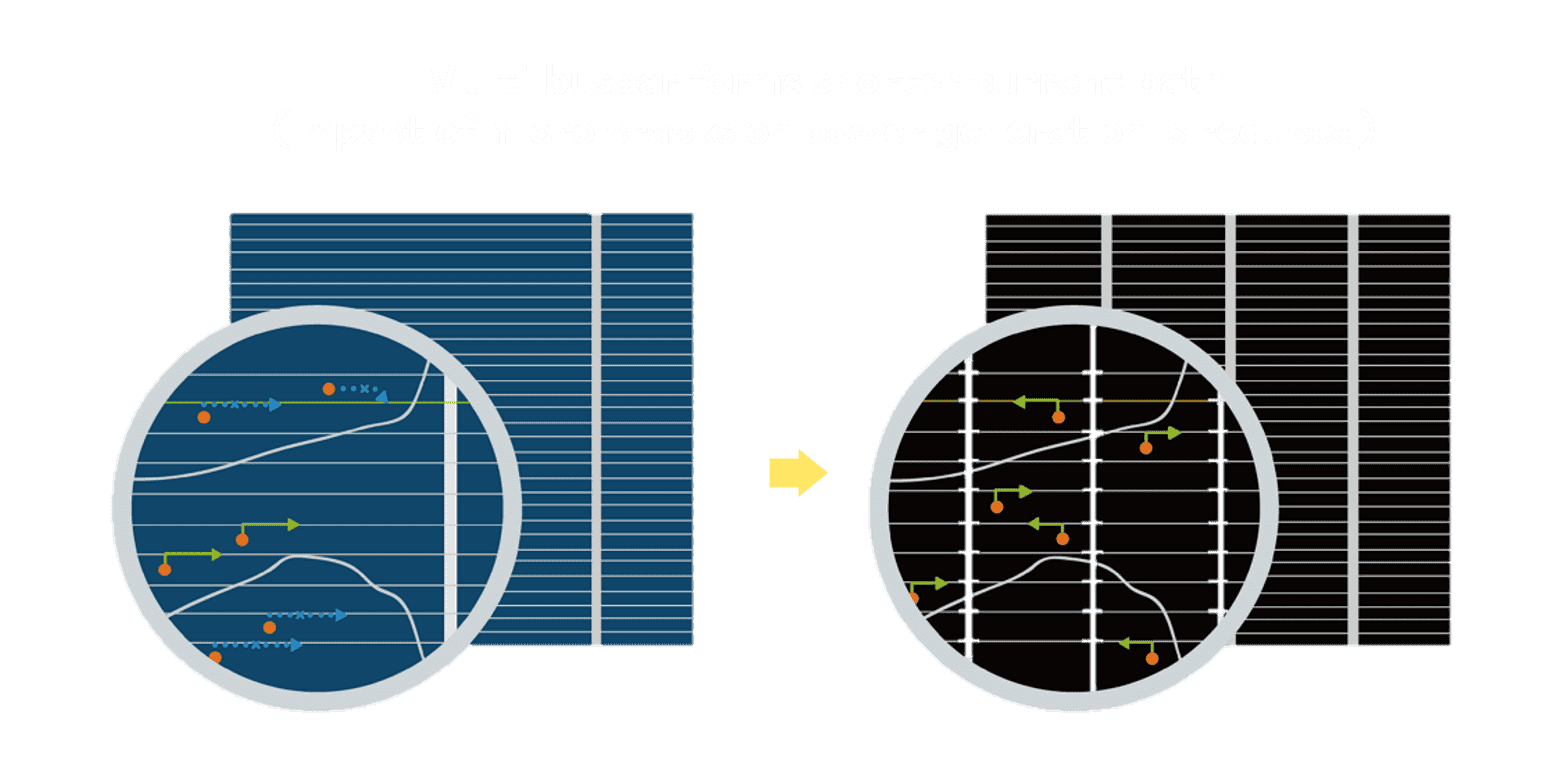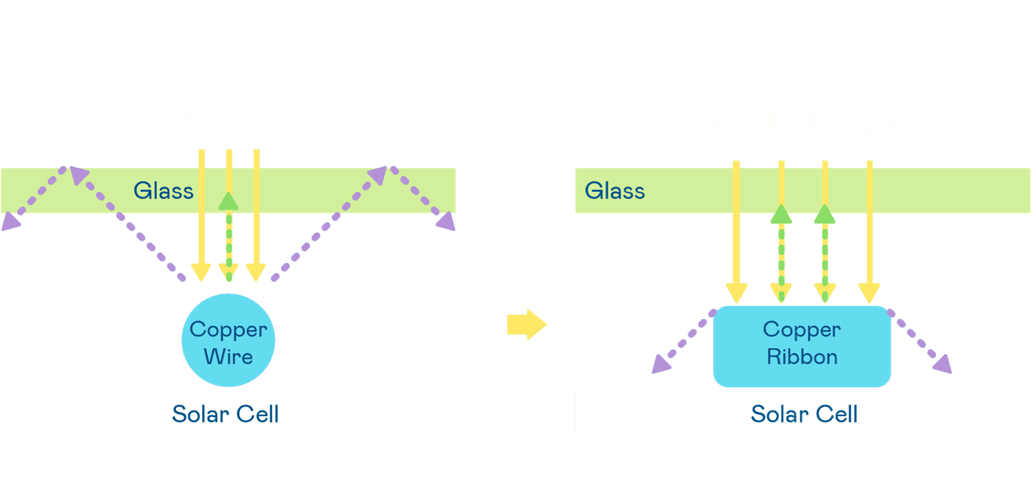 • 电池使用多条铜导线 (Copper wire) 于电池片上形成较短的电流路径,,,,提高电流收集效率,,,,采用圆形设计的铜导线较传统扁平式的铜焊带 (Ribbon),,,,可增加入射至电池的光线量。。